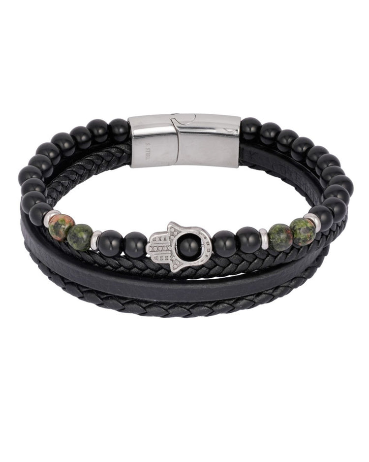 Zwart leer, diepe kralen en dat handje… voelt bijna als een talisman.