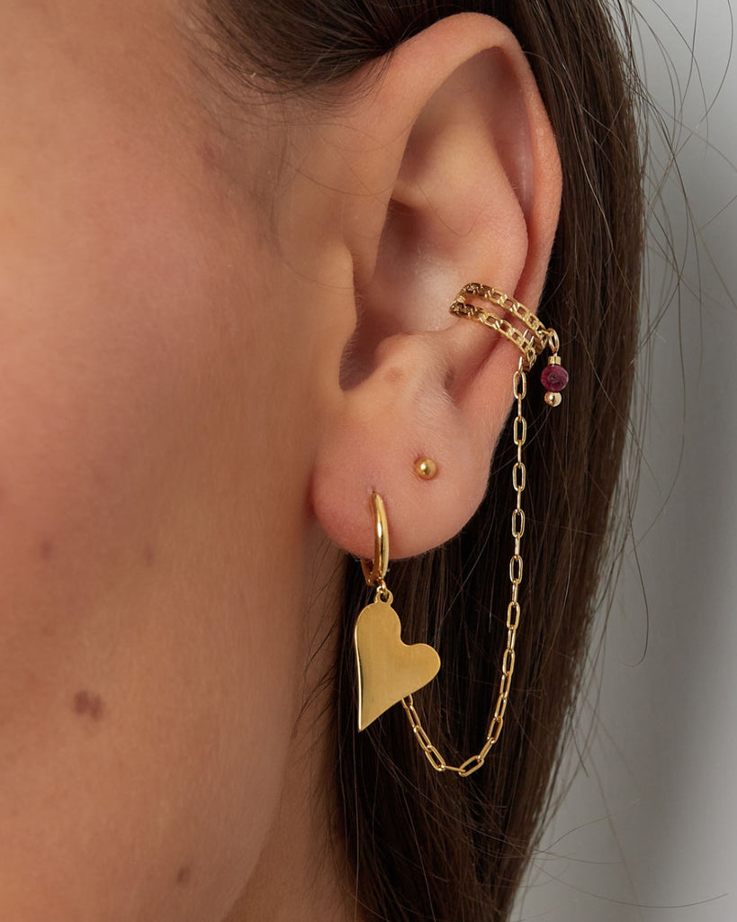 Met een schattig hartvormig bedeltje, een speelse groene kraal én een subtiel kettinkje dat de oorbel en earcuff met elkaar verbindt, is dit sieraad perfect voor een trendy en opvallende look. De vrolijke uitstraling maakt deze set superleuk om te mixen en matchen met andere sieraden met steentjes. Gemaakt van roestvrij staal en siersteentjes. Diameter: 10,5 cm. Verkrijgbaar in de kleuren roze en paars.