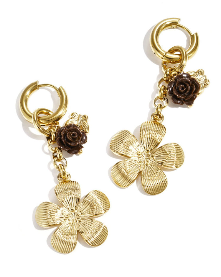 Goudkleurige bloemen van roestvrij staal met een warm bruin detail – chic, speels en net een beetje extra. Licht om te dragen, maar groot genoeg voor een echte statement look. Perfect voor elke dag, maar ook super leuk bij een avondoutfit.