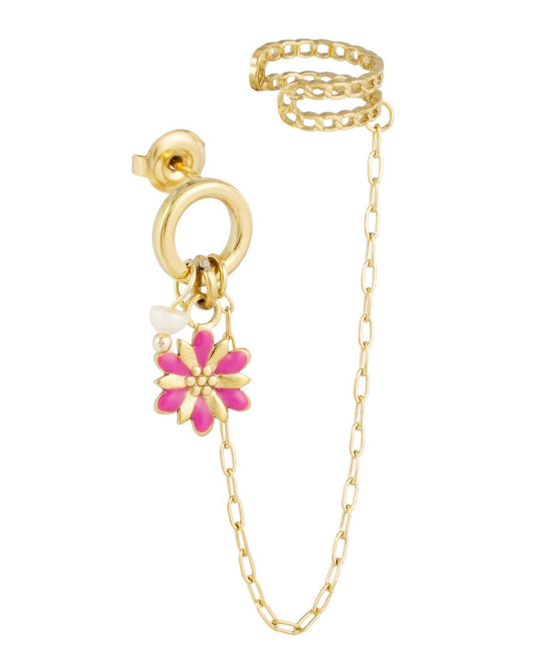 Deze gouden earparty is zó cute! Het roze bloemetje danst speels onder het ringetje, terwijl het fijne kettinkje en het ear cuff detail zorgen voor een trendy, layered look – zonder extra gaatjes 😉